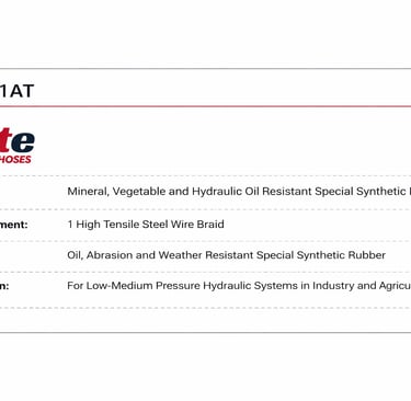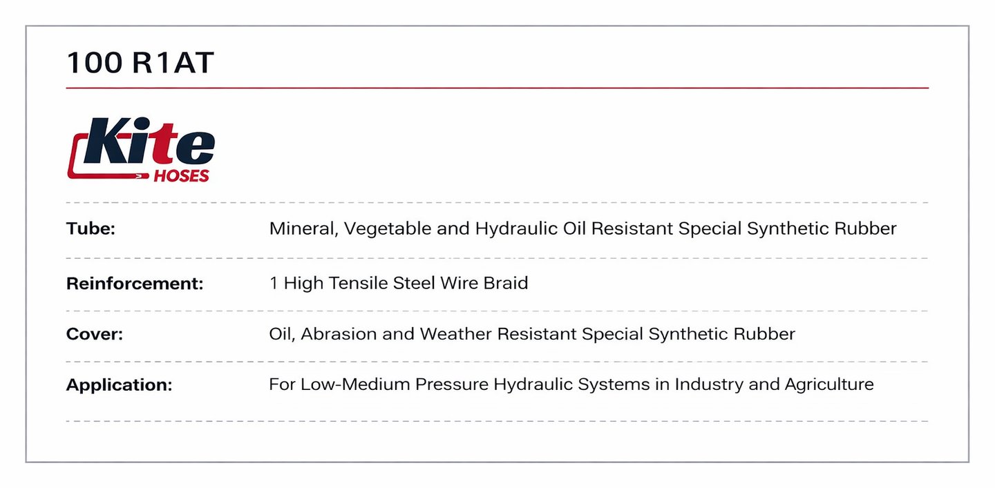 The 100 R1AT Hydraulic Hose is a high-performance, single-wire braided hydraulic hose designed for low to medium pressure hydraulic applications in industrial and agricultural environments. Engineered for durability and reliability, it offers excellent resistance to oil, abrasion, and weather conditions, making it suitable for demanding operating environments.