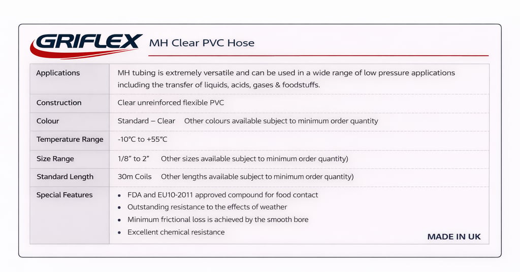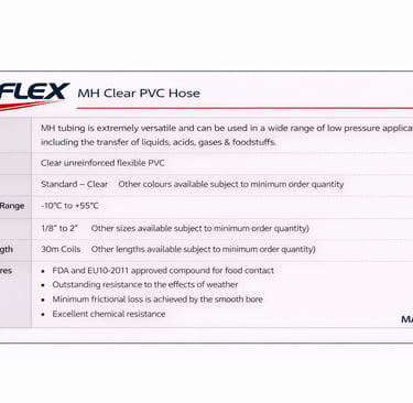 The MH Clear PVC Hose is a lightweight and flexible solution designed for the transfer of liquids, gases, and light chemicals under low pressure. Made from high-quality clear PVC, it offers excellent transparency for easy monitoring of flow.