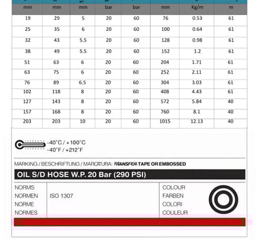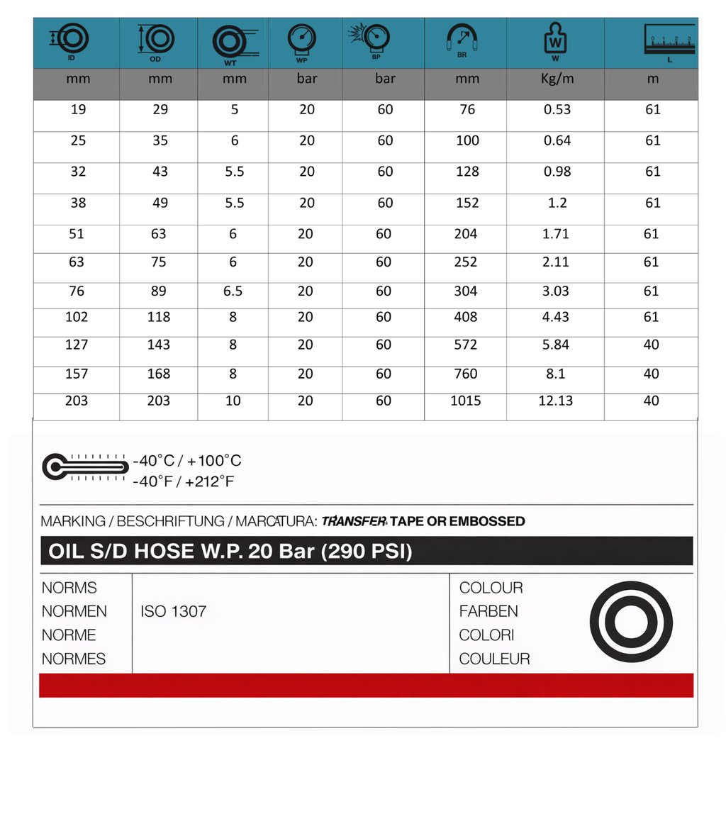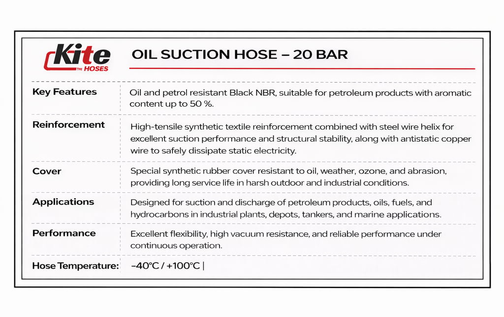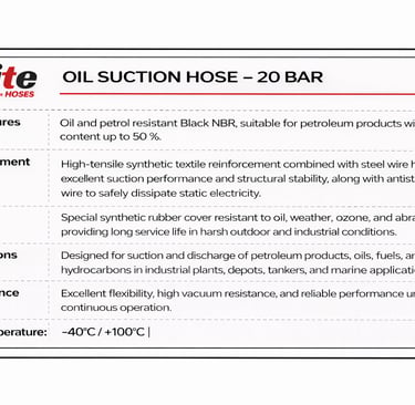 The Oil Suction Hose – 20 Bar is engineered for heavy-duty suction and discharge of petroleum-based products in industrial applications. Designed with a high-performance oil- and fuel-resistant inner tube, this hose ensures safe handling of oils, fuels, and petroleum products, including those with high aromatic content. Its reinforced construction provides excellent resistance to vacuum, pressure, and mechanical stress, making it ideal for demanding environments such as refineries, tank farms, and industrial transfer operations.