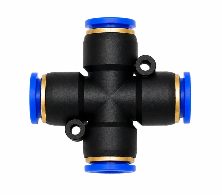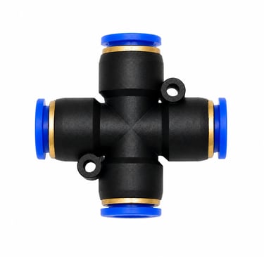 A Pneumatic 4-Way Connector (Cross Union) is a push-to-connect fitting designed to distribute compressed air into four directions from a single point. It is ideal for applications where multiple air lines need to be connected efficiently in a compact setup.