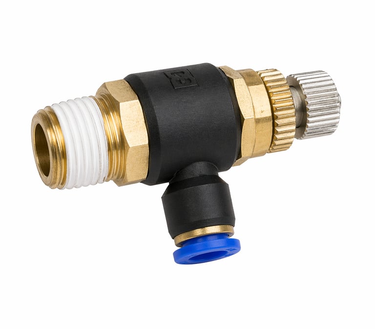This fitting allows precise control of air flow to pneumatic actuators, helping to regulate the speed of cylinders and improve system efficiency. Its durable construction ensures reliable performance in industrial and automation applications.