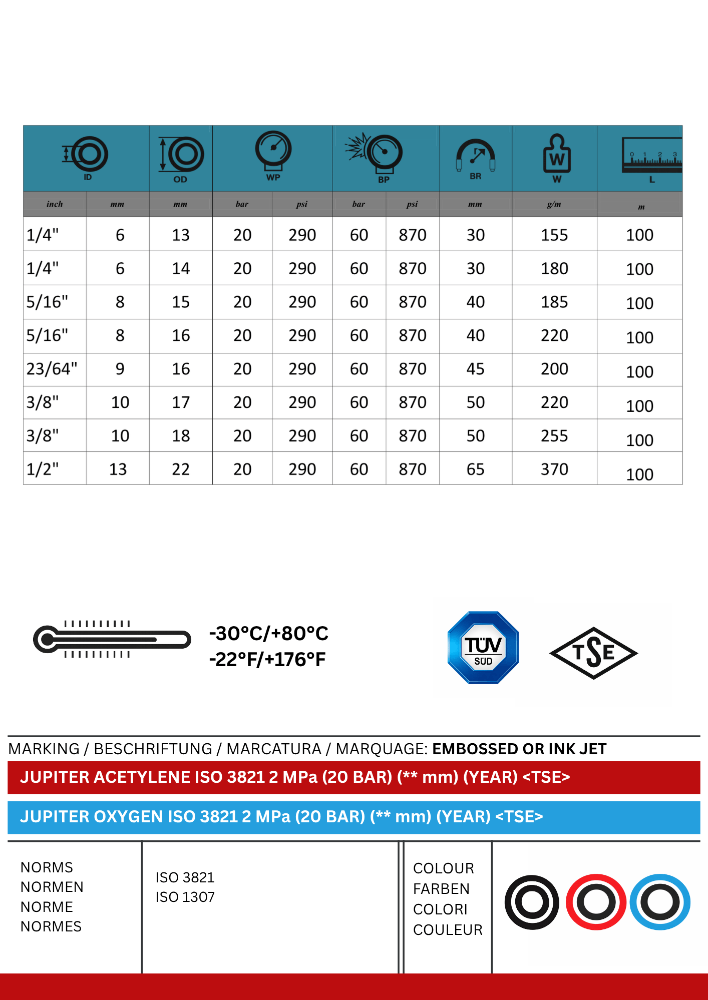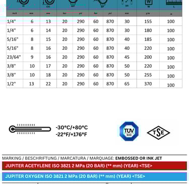 Tube: Black smooth synthetic rubber resistant to oxygen and acetylene.