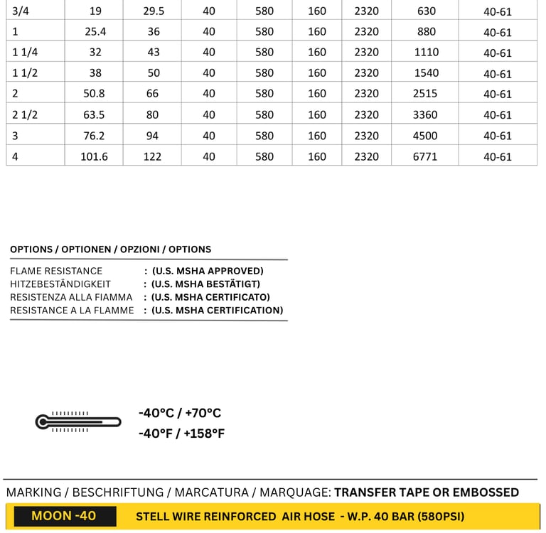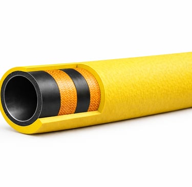 The Yellow Air Hose – 40 Bar is a high-pressure industrial hose designed for demanding air transfer applications, particularly in mining environments. Manufactured with a synthetic NBR rubber tube resistant to oil-mist mixed air and inert fluids, it ensures reliable performance under high pressure conditions. Reinforced with high tensile steel wire and protected by a durable pin-pricked outer cover, this hose delivers strength, flexibility, and long service life in harsh working conditions.